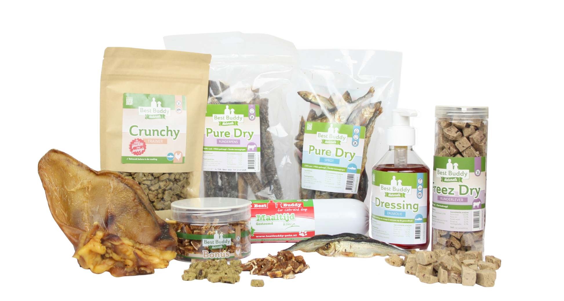 Het BestBuddy Proeverij Pakket is dé perfecte kennismaking met de natuurlijke snacks van BestBuddy. Dit gevarieerde pakket bevat een samenstelling van kauwsnacks, kluifjes, trainingssnacks en gestoomde maaltijden van verschillende diersoorten zoals rund, kip, konijn, varken en vis. Geschikt voor honden van klein tot groot, zodat iedere hond kan genieten van een smaakvol en verantwoord tussendoortje.