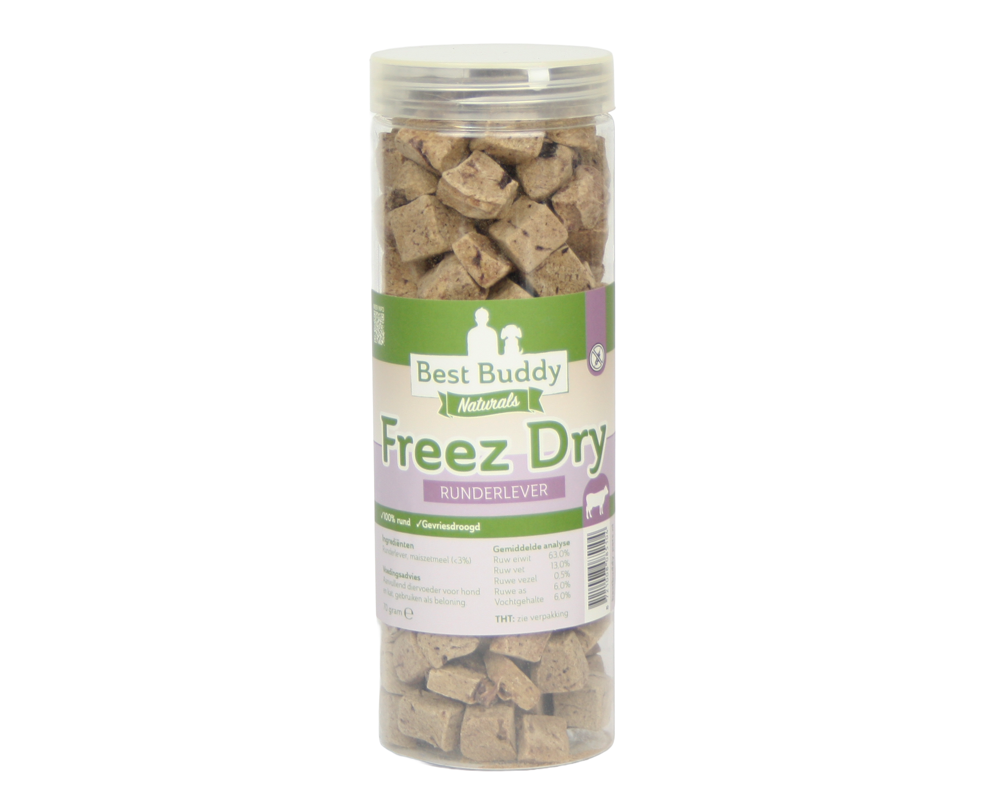 Runderlever bevat van nature veel hoogwaardige eiwitten, vitamine A, vitamine B12, foliumzuur, choline, selenium, koper en ijzer. Dankzij het vriesdroogproces blijven al deze voedingsstoffen optimaal behouden, waardoor je huisdier profiteert van een gezonde en voedzame beloning. De runderlever wordt gemalen en gevriesdroogd, waardoor de snack licht van gewicht is en gemakkelijk te doseren.