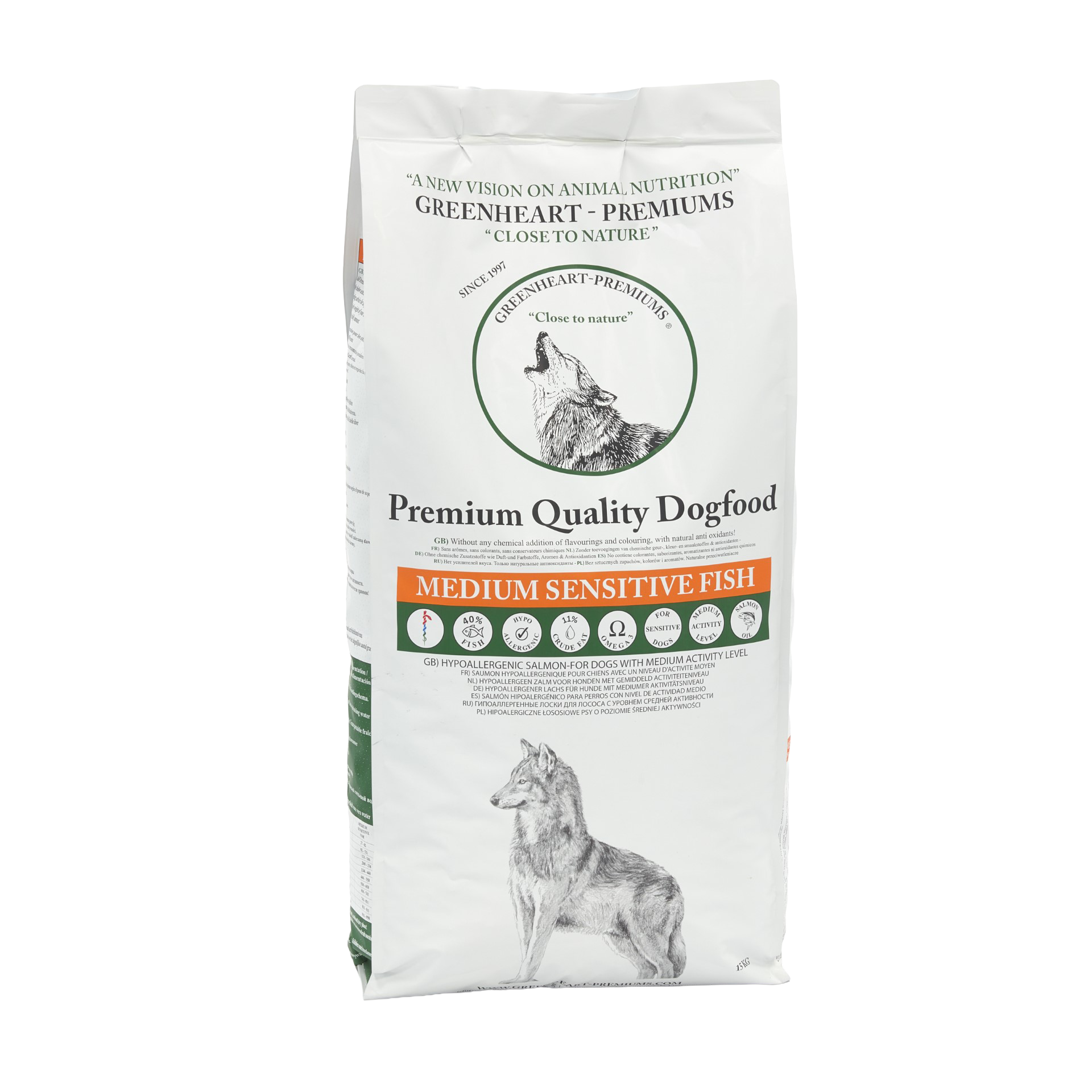 Medium Sensitive Fish van Greenheart Premiums is een brokvoeding rijk aan vis, speciaal ontwikkeld voor de gemiddeld actieve hond. De enige dierlijke eiwitbron in deze brok is gedroogde zalm, waardoor deze voeding uitermate geschikt is voor hypoallergene diëten. Deze tarweglutenvrije hondenbrok kan daarnaast worden ingezet bij honden met huid- en vachtproblemen.