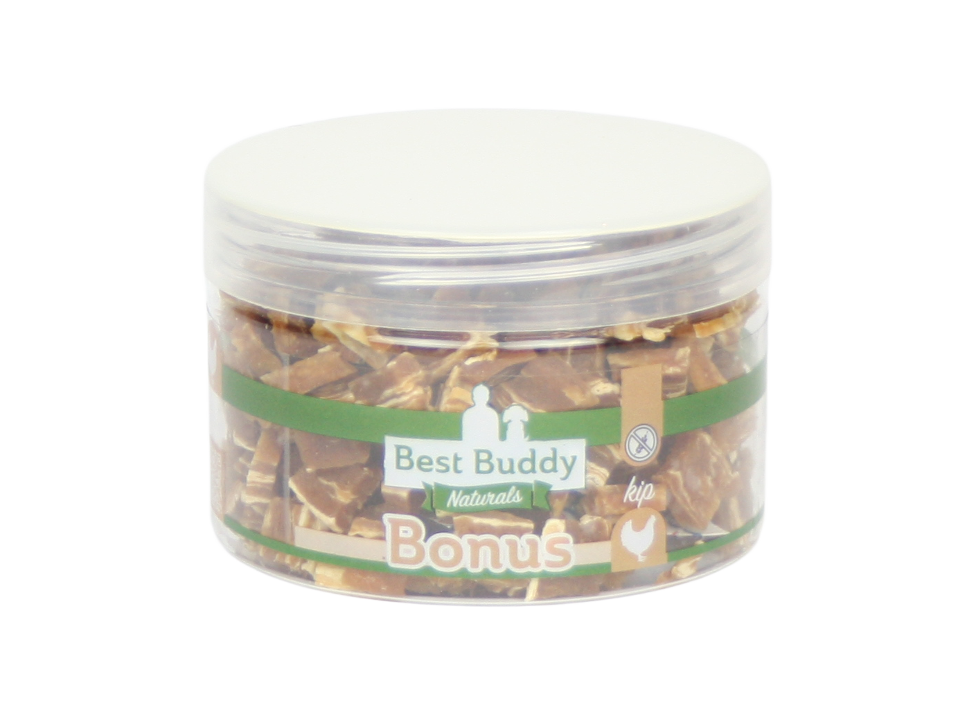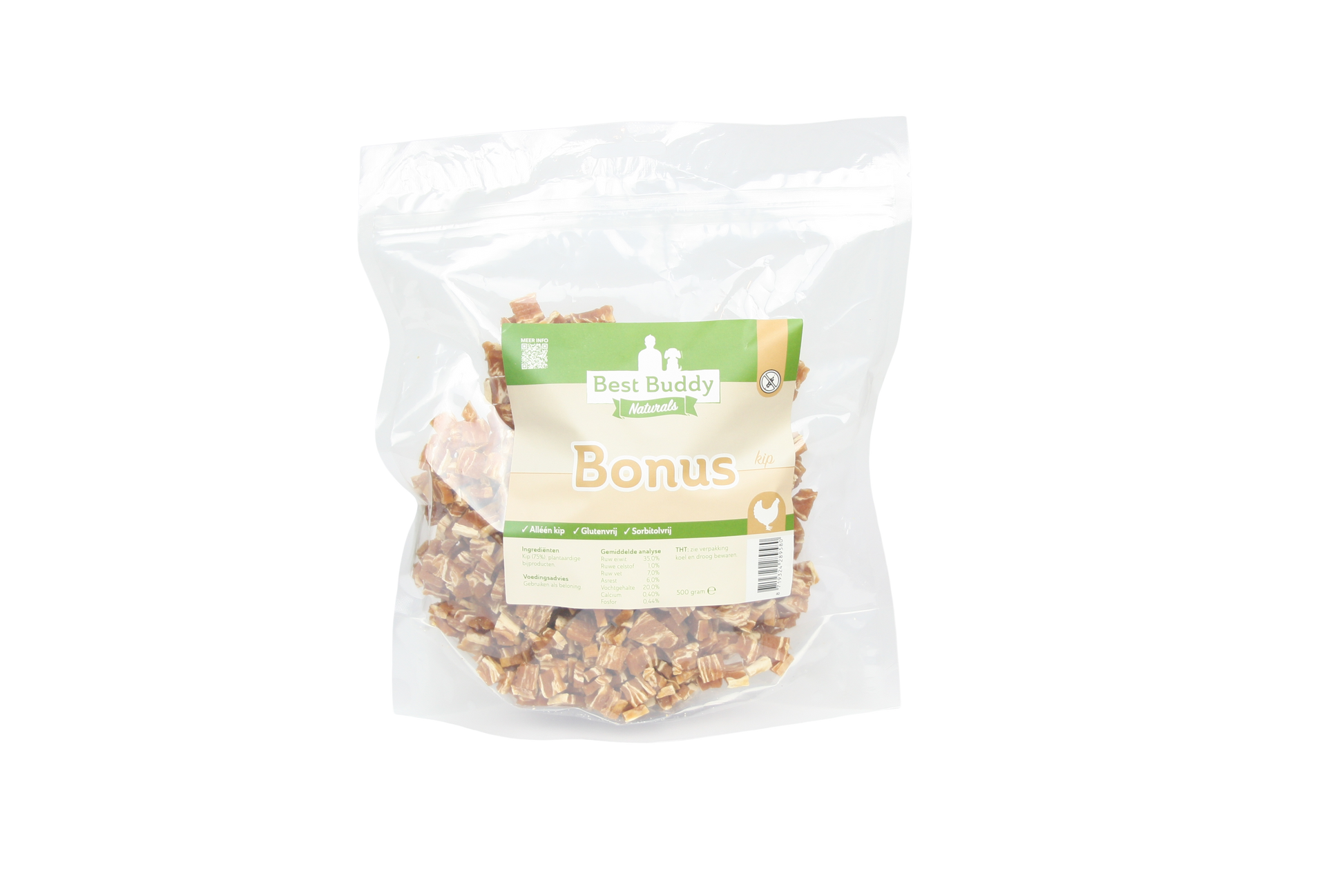 De Kip Bonus van BestBuddy is een heerlijke, gezonde snack gemaakt van 100% spiervlees van kip, geschikt voor humane consumptie. Door het speciale droogproces blijft de natuurlijke smaak en geur van het kippenvlees optimaal behouden. Deze snacks zijn ideaal voor honden en katten met een gevoelig maag-darmstelsel, omdat ze vrij zijn van gluten en sorbitol.
