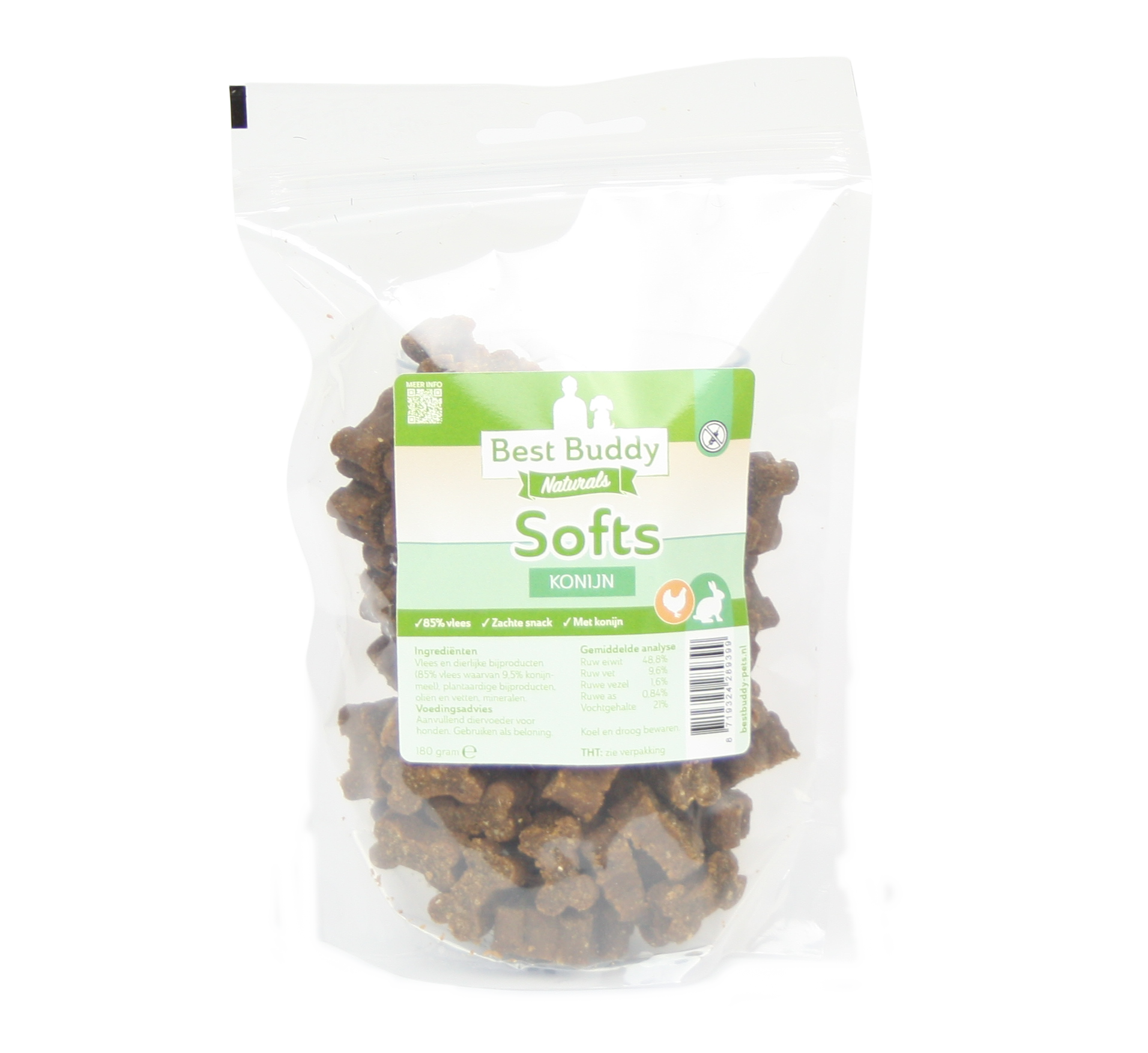 Dankzij de zachte structuur zijn de Softs eenvoudig te breken, waardoor ze geschikt zijn voor zowel kleine als grote honden. Bovendien zijn ze vrij van gluten en kunstmatige geur-, kleur- en smaakstoffen. Een 100% natuurlijk én betaalbaar alternatief voor de bekende emmertjes trainingssnacks.